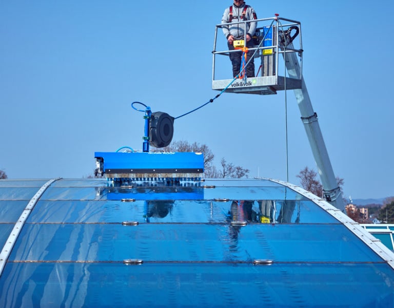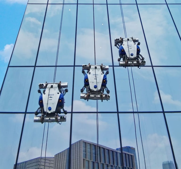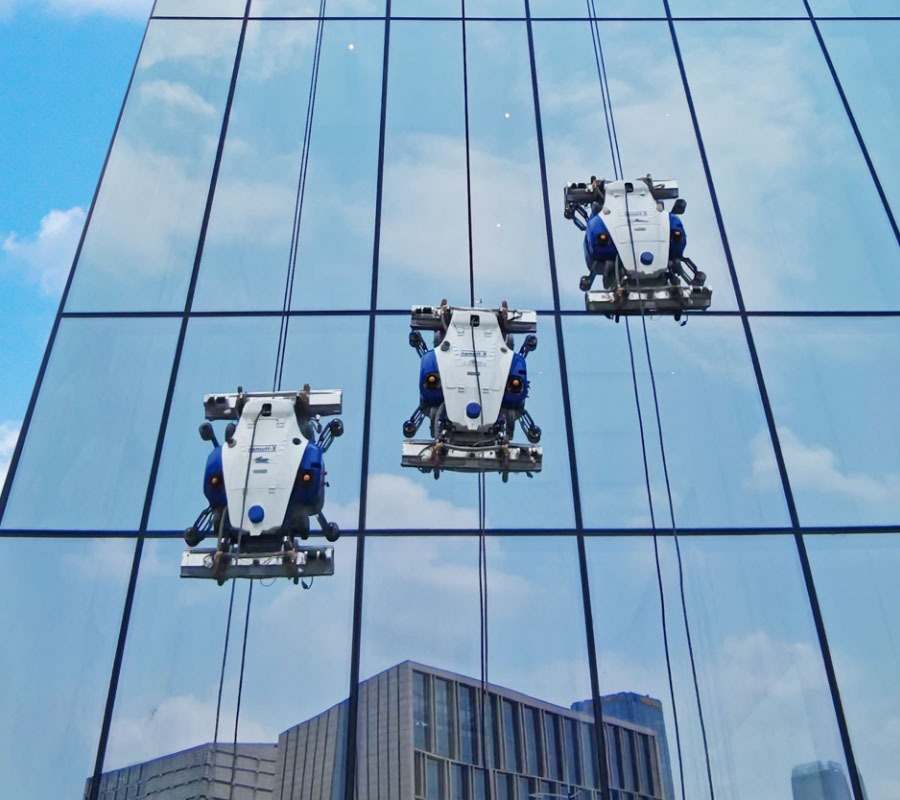 We deploy high-precision climbing robots for high-rise glass exteriors and synchronized smart systems for large-scale facilities